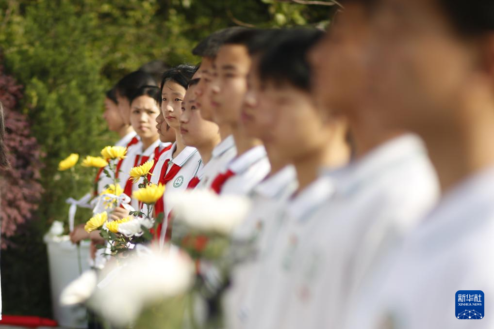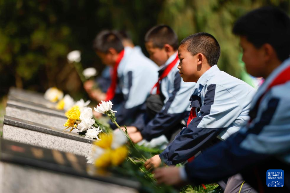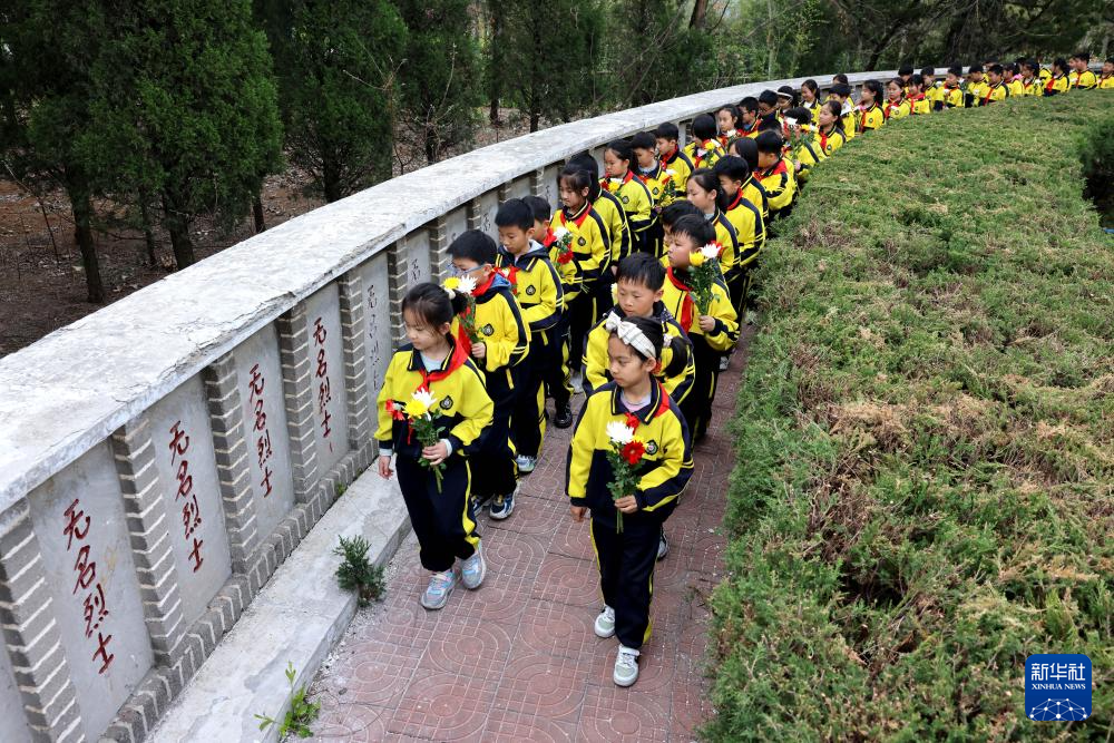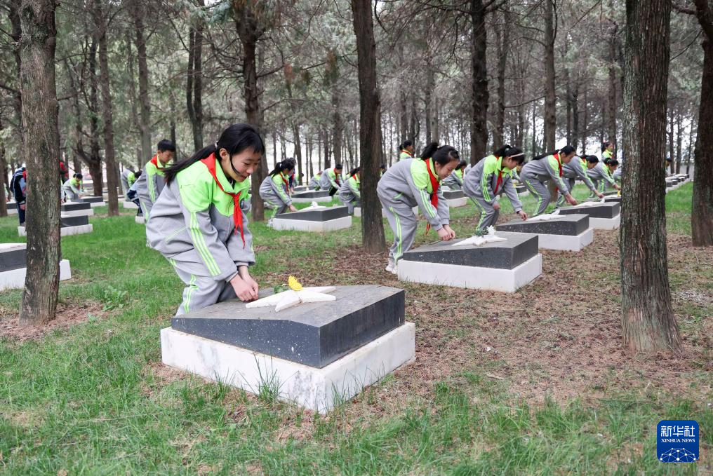 4月2日,在位于河北省石家莊市的華北軍區(qū)烈士陵園,學(xué)生們?yōu)楦锩⒘耀I花。