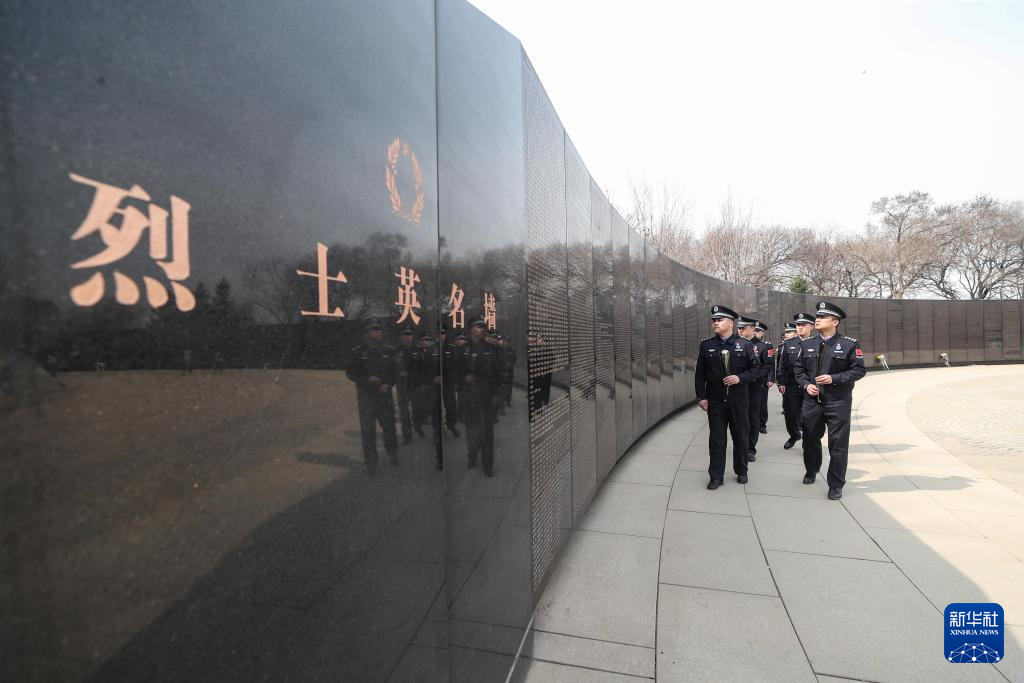 4月2日,在沈陽抗美援朝烈士陵園,沈陽出入境邊防檢查站民警瞻仰烈士英名墻。