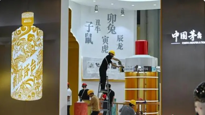 4月10日,第四屆中國國際消費品博覽會參展物品陸續(xù)上架。圖為茅臺展位的工作人員進(jìn)行收尾施工。中新社記者 駱云飛 攝