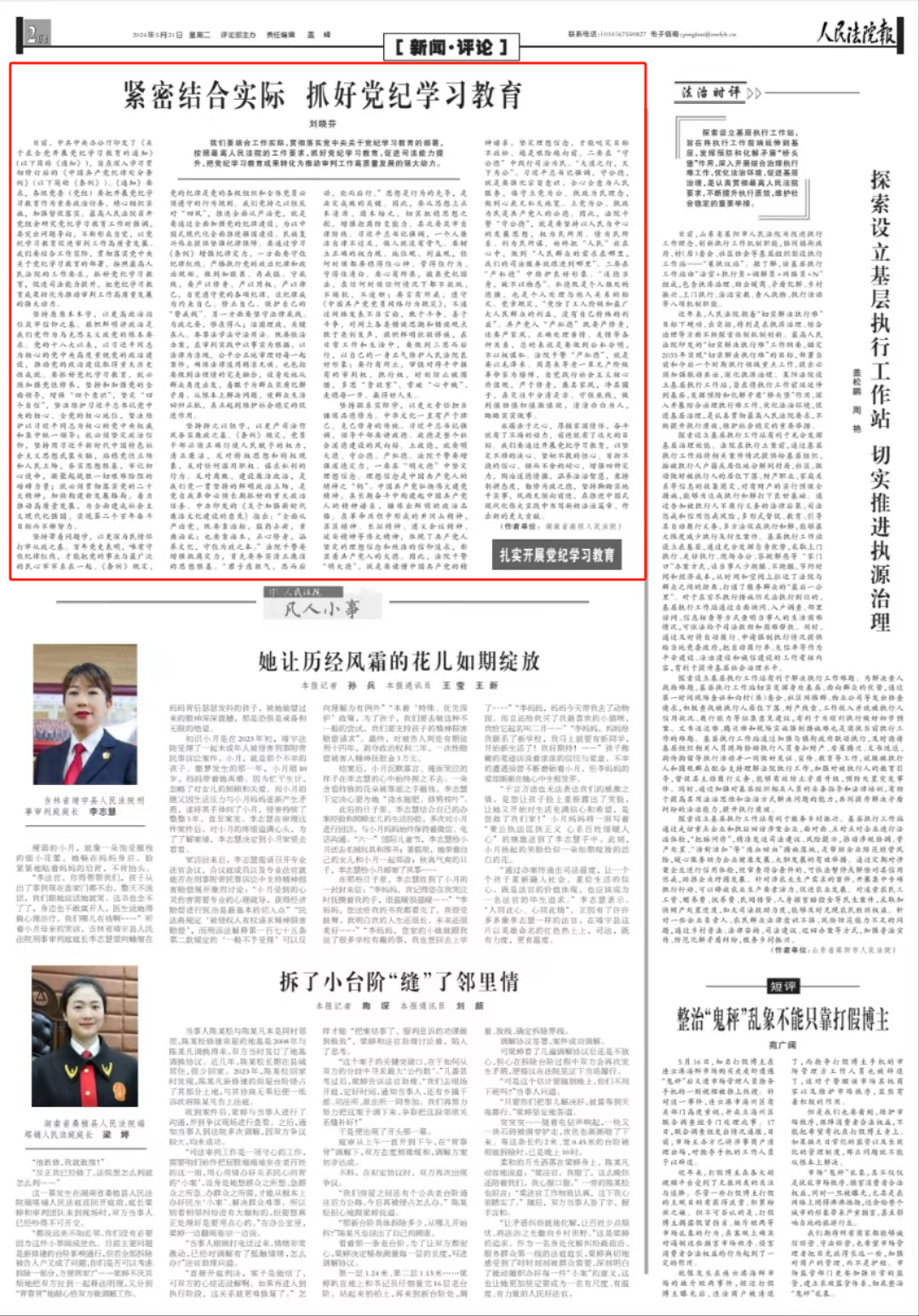 堅(jiān)持帶著問題學(xué),以更深為民情懷打牢從政之基。百年黨史表明,唯有守住紀(jì)律紅線,才能把黨的事業(yè)與最廣泛的民心牢牢系在一起?!稐l例》規(guī)定,黨的紀(jì)律是黨的各級組織和全體黨員必須遵守的行為規(guī)則。我們黨持之以恒反對“四風(fēng)”,推進(jìn)全面從嚴(yán)治黨,就是要通過全面加強(qiáng)黨的紀(jì)律建設(shè),為以中國式現(xiàn)代化全面推進(jìn)強(qiáng)國建設(shè)、民族復(fù)興偉業(yè)提供堅(jiān)強(qiáng)紀(jì)律保障。要通過學(xué)習(xí)《條例》增強(qiáng)紀(jì)律定力,一方面要守住紀(jì)律紅線。嚴(yán)格執(zhí)行黨的政治紀(jì)律和政治規(guī)矩,做到知敬畏、存戒懼、守底線,要嚴(yán)以修身、嚴(yán)以用權(quán)、嚴(yán)以律己,自覺遵守黨的各項(xiàng)紀(jì)律,讓紀(jì)律成為約束自己、修正自己、保護(hù)自己的“警戒線”。另一方面要堅(jiān)守法律底線。為政之要,惟在得人;治國理政,關(guān)鍵在人。要尊法學(xué)法守法用法。既要依法辦案,在審判實(shí)踐中以事實(shí)為根據(jù)、以法律為準(zhǔn)繩,公平公正地審理好每一起案件,確保法律適用精準(zhǔn)無誤,也包括要做到法理情的完美融合,設(shè)身處地從群眾角度出發(fā),著眼于為群眾實(shí)質(zhì)化解矛盾、從根本上解決問題,使群眾生活回歸正軌,真正起到維護(hù)社會穩(wěn)定的促進(jìn)作用。