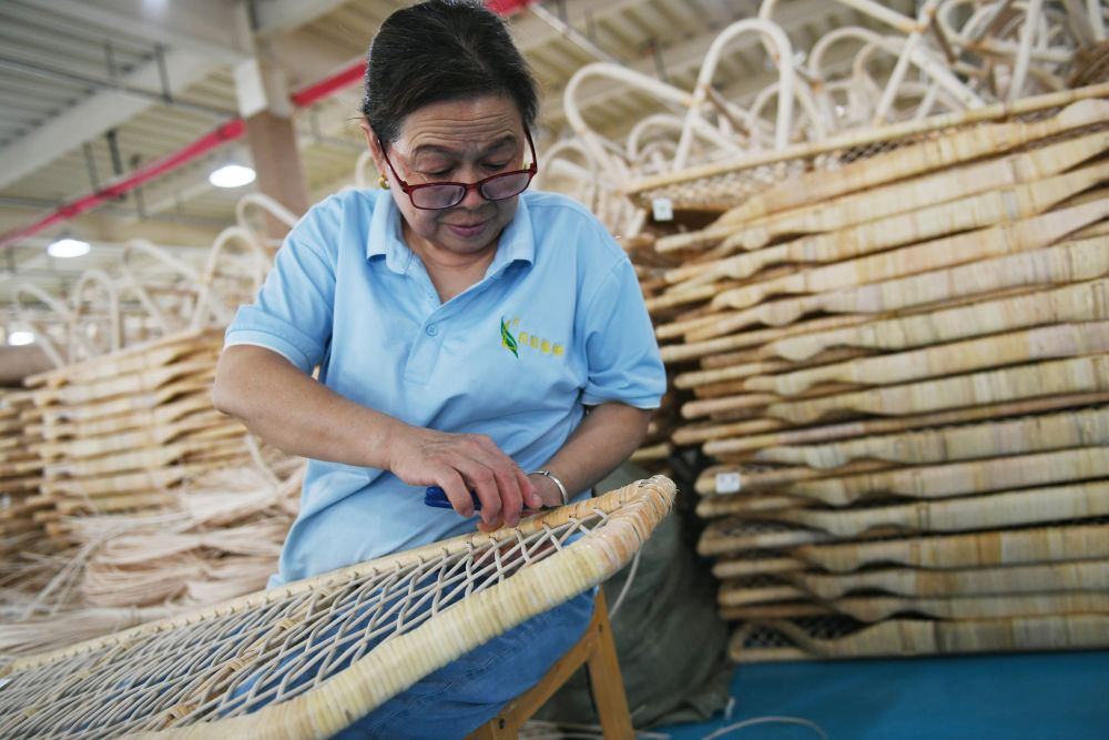 2023年9月7日,在位于漢中市的陜西良順匠心實(shí)業(yè)有限公司,工作人員在編織藤制品。新華社記者 張曼怡 攝
