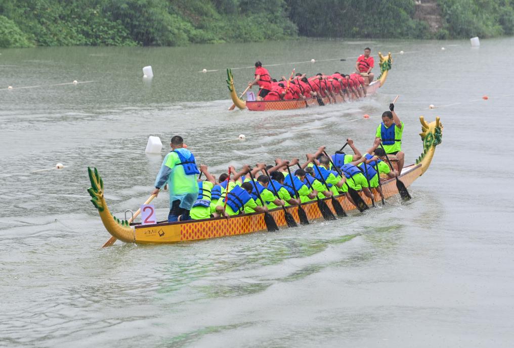 5月29日,在酉陽縣龍?zhí)舵?zhèn),龍舟隊(duì)在水面角逐。
