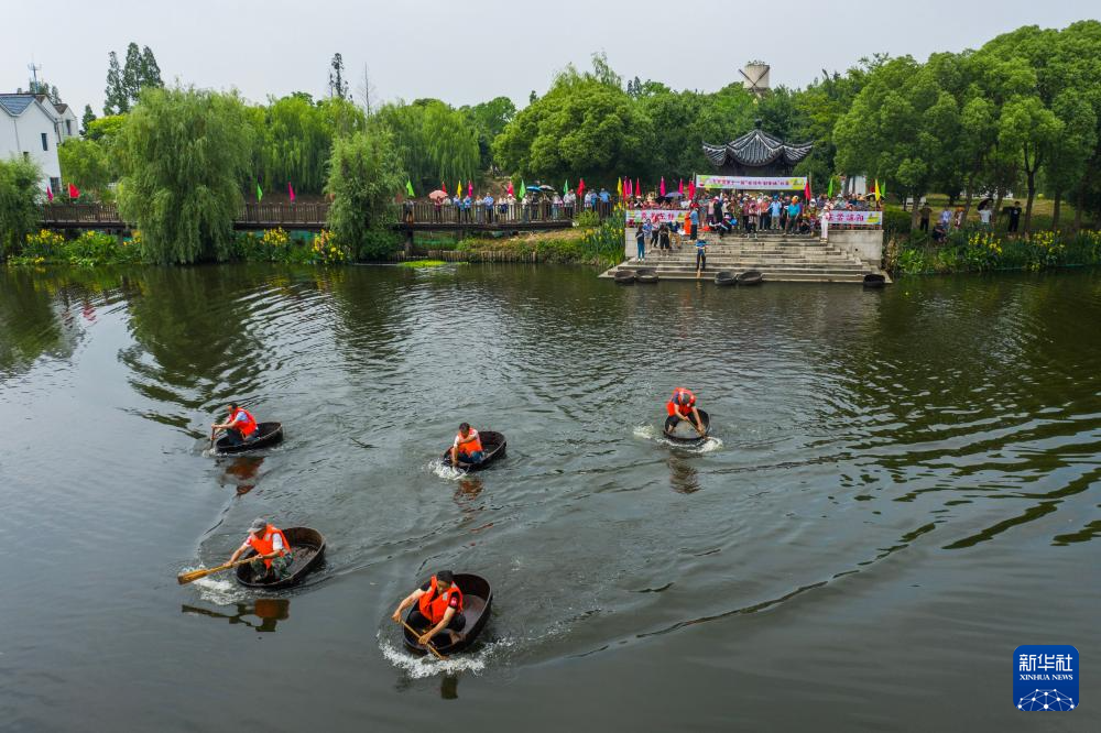 當(dāng)日,浙江省湖州市吳興區(qū)東林鎮(zhèn)舉辦“慶端午 劃菱桶”水鄉(xiāng)端午趣味民俗活動,來自東林鎮(zhèn)各村的村民們在泉益村參加了水鄉(xiāng)劃菱桶比賽、荷塘釣小龍蝦、做艾草花束、包粽子等端午趣味民俗活動,在初夏時節(jié)呈現(xiàn)江南水鄉(xiāng)特有的迎端午氣氛。