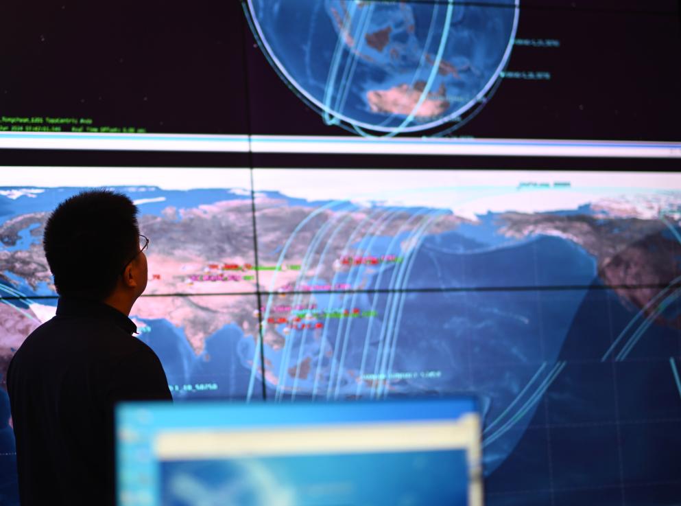 在云遙宇航的展廳內(nèi),李峰輝查看顯示屏實(shí)時顯示的衛(wèi)星各項(xiàng)數(shù)據(jù)(6月4日攝)。