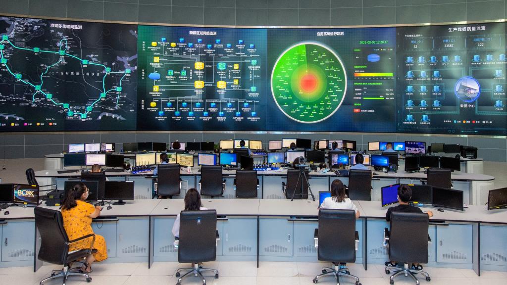 2023年12月6日,中國石油新疆油田公司生產(chǎn)指揮中心的監(jiān)控大屏實(shí)時(shí)顯示油田生產(chǎn)動(dòng)態(tài)數(shù)據(jù)。新華社發(fā)(閔勇 攝)