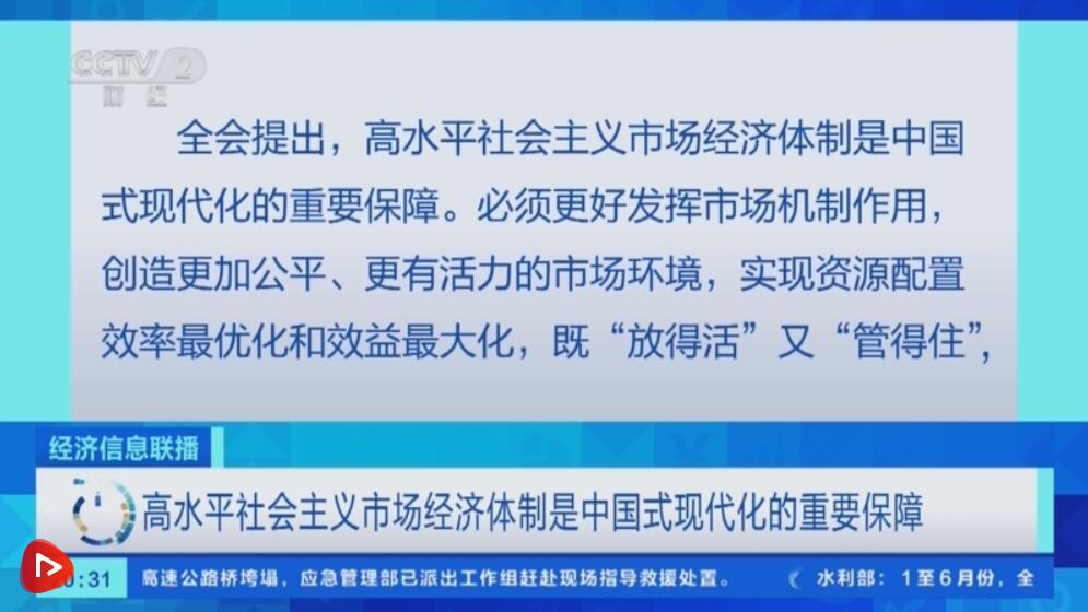 全會(huì)提出,高水平社會(huì)主義市場(chǎng)經(jīng)濟(jì)體制是中國式現(xiàn)代化的重要保障。必須更好發(fā)揮市場(chǎng)機(jī)制作用,創(chuàng)造更加公平、更有活力的市場(chǎng)環(huán)境,實(shí)現(xiàn)資源配置效率最優(yōu)化和效益最大化,既“放得活”又“管得住”,更好維護(hù)市場(chǎng)秩序、彌補(bǔ)市場(chǎng)失靈,暢通國民經(jīng)濟(jì)循環(huán),激發(fā)全社會(huì)內(nèi)生動(dòng)力和創(chuàng)新活力。要毫不動(dòng)搖鞏固和發(fā)展公有制經(jīng)濟(jì),毫不動(dòng)搖鼓勵(lì)、支持、引導(dǎo)非公有制經(jīng)濟(jì)發(fā)展,保證各種所有制經(jīng)濟(jì)依法平等使用生產(chǎn)要素、公平參與市場(chǎng)競(jìng)爭(zhēng)、同等受到法律保護(hù),促進(jìn)各種所有制經(jīng)濟(jì)優(yōu)勢(shì)互補(bǔ)、共同發(fā)展。要構(gòu)建全國統(tǒng)一大市場(chǎng),完善市場(chǎng)經(jīng)濟(jì)基礎(chǔ)制度。