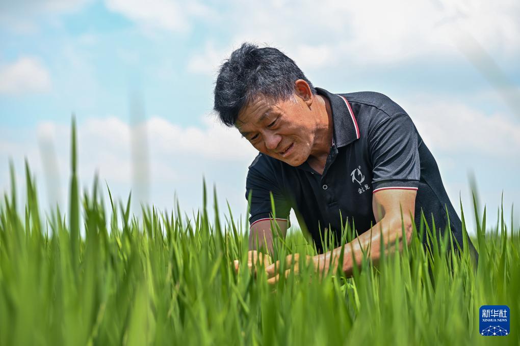 7月25日,安徽鳳陽小崗村種糧大戶程夕兵在田里觀察水稻長勢。新華社記者 李鑫 攝