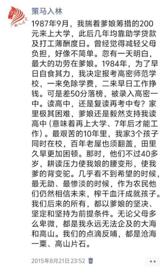 2015年8月21日微信朋友圈帖文,此帖點(diǎn)贊評論互動量500多次。