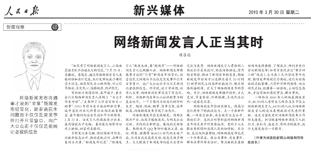 2010年3月30日,《人民日?qǐng)?bào)》刊發(fā)《網(wǎng)絡(luò)新聞發(fā)言人正當(dāng)其時(shí)》。
