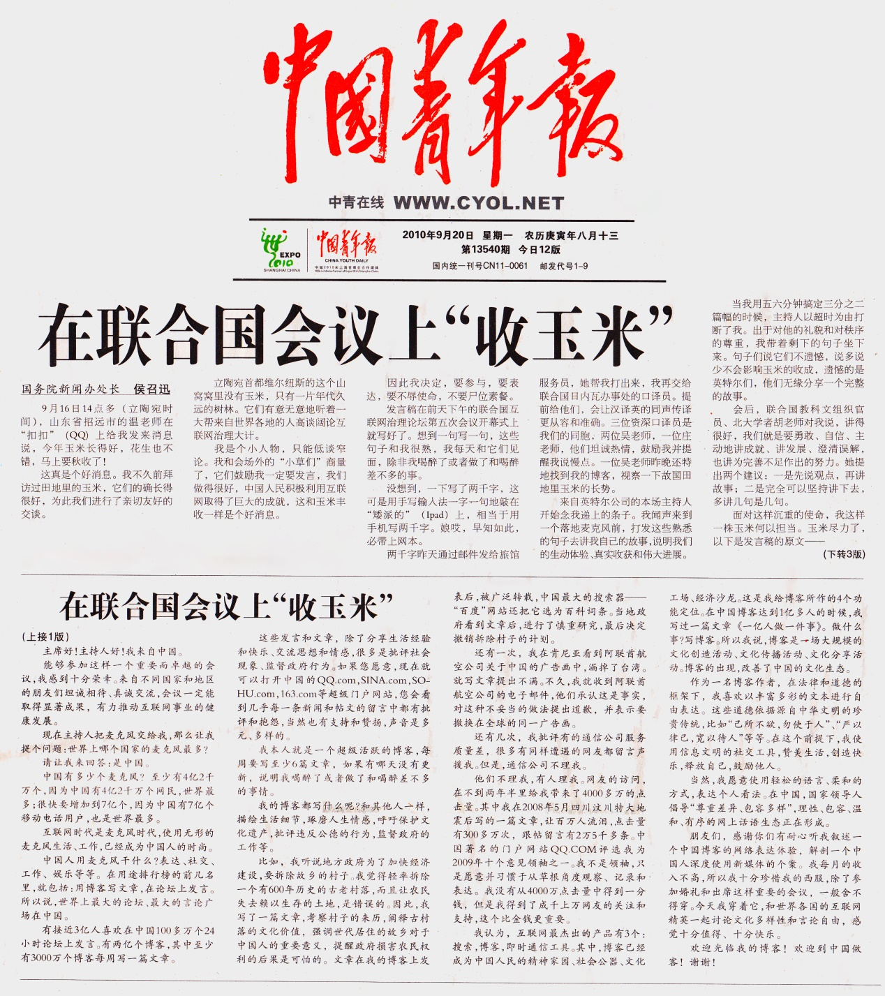 2010年9月20日,《中國(guó)青年報(bào)》一版刊發(fā)《在聯(lián)合國(guó)會(huì)議上“收玉米”》。