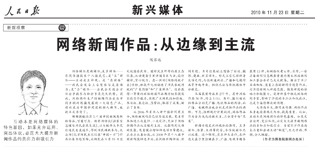 2010年11月23日,《人民日?qǐng)?bào)》刊發(fā)《網(wǎng)絡(luò)新聞作品:從邊緣到主流》。