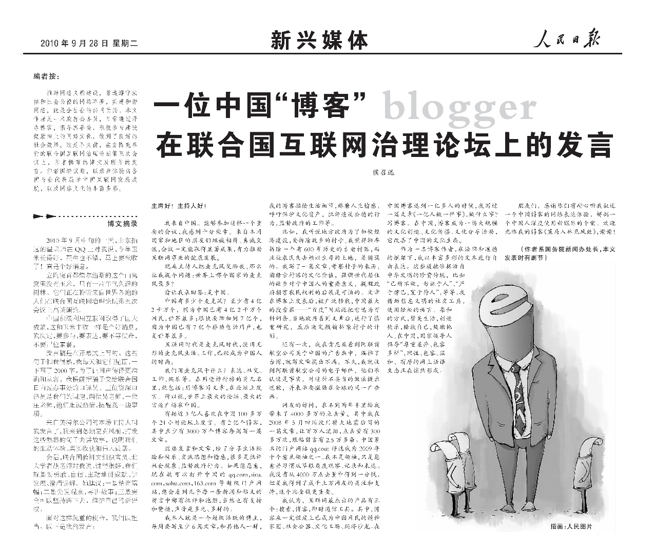 2010年9月28日,《人民日?qǐng)?bào)》刊發(fā)《一位中國(guó)博客在聯(lián)合國(guó)互聯(lián)網(wǎng)治理論壇上的發(fā)言》。