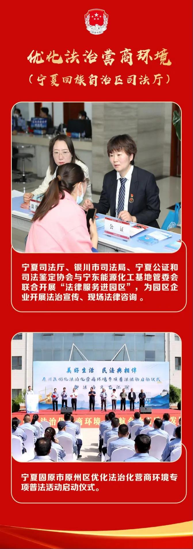 張任:深入開(kāi)展公共法律服務(wù)護(hù)航先行區(qū)建設(shè)專(zhuān)項(xiàng)行動(dòng),建立民營(yíng)企業(yè)法律服務(wù)綠色通道,組建西北首家公共法律服務(wù)專(zhuān)家?guī)欤剿髟O(shè)立首家金融“共享法庭”,點(diǎn)單式開(kāi)展“百所聯(lián)百會(huì)”“百名律師進(jìn)千企”“送法進(jìn)民企”等活動(dòng),將“最多跑一次”公證服務(wù)事項(xiàng)從48項(xiàng)擴(kuò)大至180項(xiàng)?!皩幭脑乒卜煞?wù)中心”建設(shè)項(xiàng)目獲2023年全國(guó)智慧公共法律服務(wù)創(chuàng)新案例,落實(shí)普法責(zé)任制“四清單一辦法”經(jīng)驗(yàn)做法被全國(guó)“八五”普法規(guī)劃吸納。制定民營(yíng)企業(yè)糾紛調(diào)解工作“8條措施”,在大型企事業(yè)單位、工業(yè)園區(qū)、商會(huì)廣泛設(shè)立調(diào)解組織,矛盾糾紛化解成功率保持在96%以上,經(jīng)驗(yàn)做法在全國(guó)調(diào)解工作會(huì)上交流。