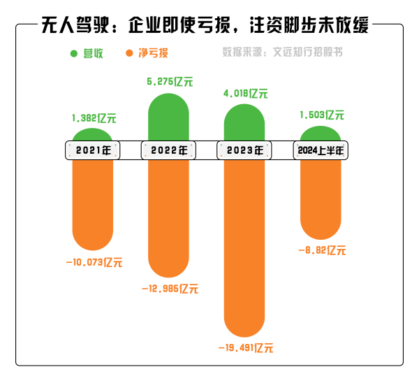以行業(yè)獨(dú)角獸——文遠(yuǎn)知行為例,打開文遠(yuǎn)知行的官網(wǎng),映入眼簾的“以無人駕駛改變?nèi)祟惓鲂小钡目谔?hào)格外引人注目。根據(jù)文遠(yuǎn)知行招股書的數(shù)據(jù),2021年至2024年上半年,文遠(yuǎn)知行實(shí)現(xiàn)營收分別為1.382億元、5.275億元、4.018億元、1.503億元,分別凈虧損10.073億元、12.985億元、19.491億元、8.82億元,三年半凈虧損超51億元,依舊沒能阻擋文遠(yuǎn)知行前進(jìn)的腳步,也從側(cè)面體現(xiàn)出無人駕駛新一輪“內(nèi)卷”似乎已經(jīng)來臨。