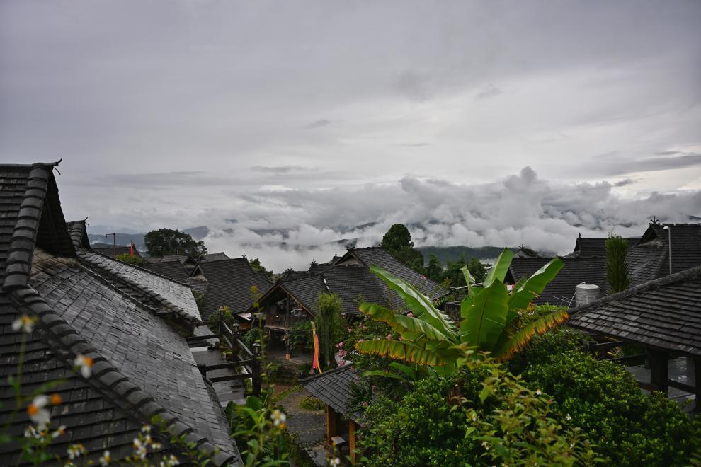 在景邁山的翁基古寨,雨水時而滂沱、時而淅瀝,游客卻依舊不少?;菝矜?zhèn)芒景村村民張光明經(jīng)營的客棧,也入住了多位游客。