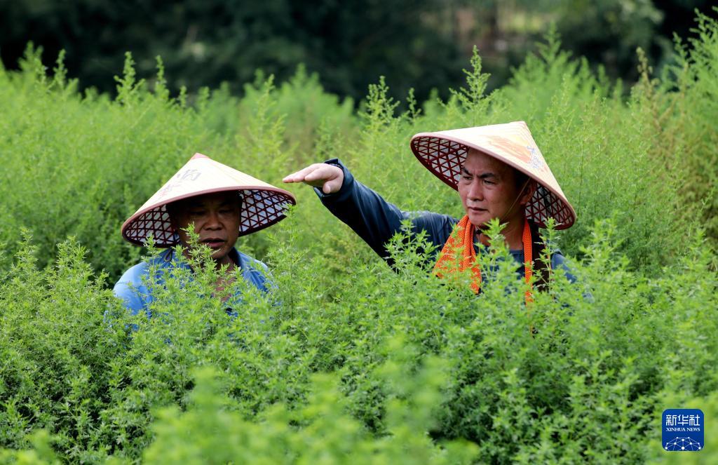 在廣西仙草堂制藥有限責(zé)任公司基地,工人在查看青蒿生長(zhǎng)情況(8月28日攝)。
