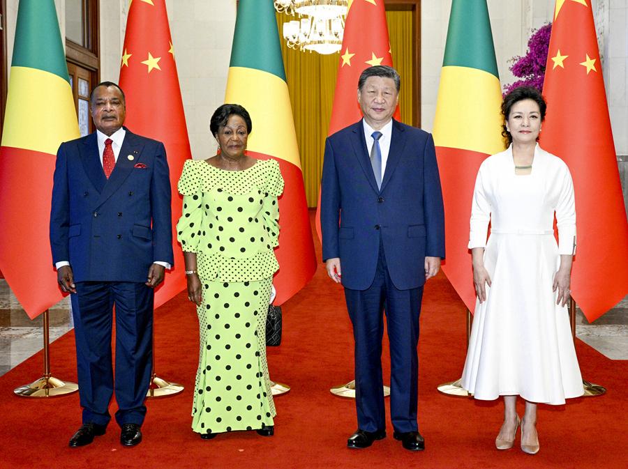 9月6日上午,國家主席習近平在北京人民大會堂同來華出席中非合作論壇北京峰會并進行國事訪問的剛果(布)總統薩蘇舉行會談。會談前,習近平和夫人彭麗媛在人民大會堂北大廳為薩蘇和夫人安托瓦內特舉行歡迎儀式。這是習近平和彭麗媛同薩蘇和安托瓦內特合影。