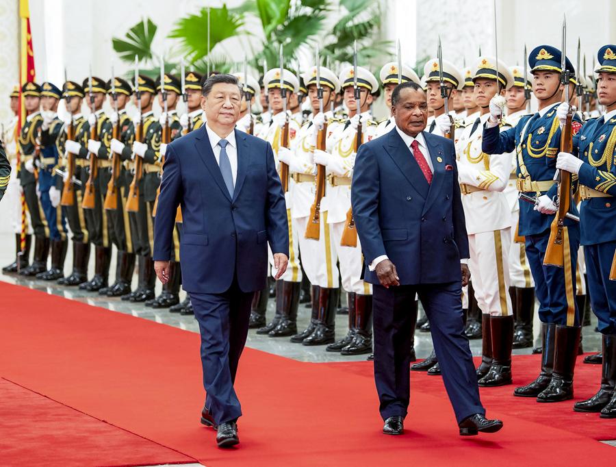 9月6日上午,國家主席習(xí)近平在北京人民大會堂同來華出席中非合作論壇北京峰會并進行國事訪問的剛果(布)總統(tǒng)薩蘇舉行會談。這是會談前,習(xí)近平在人民大會堂北大廳為薩蘇舉行歡迎儀式。