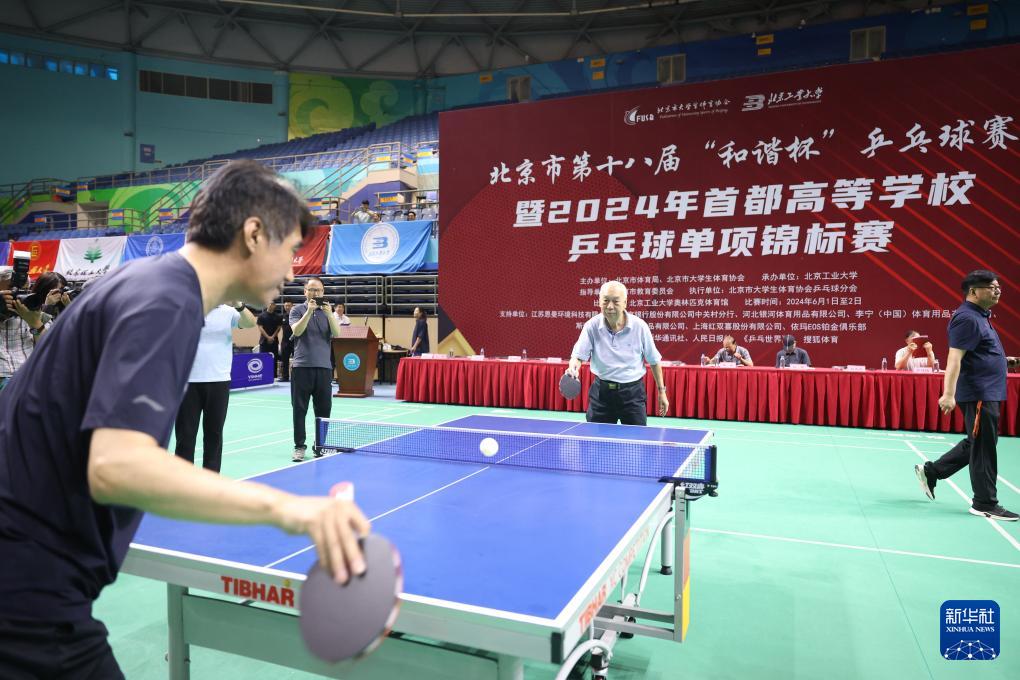 這是2024年6月1日,張燮林(后中)為北京市第十八屆“和諧杯”乒乓球賽暨2024年首都高等學(xué)校乒乓球單項(xiàng)錦標(biāo)賽開球。新華社發(fā)
