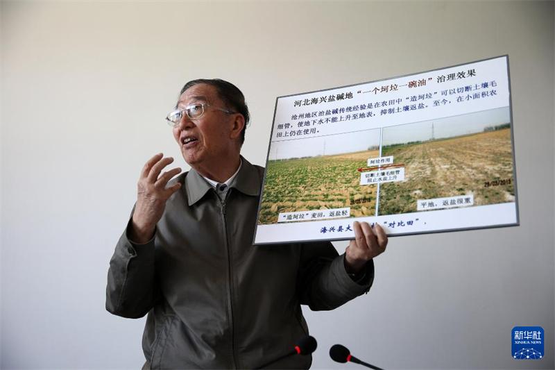 李振聲院士在介紹河北海興鹽堿地治理的前后對(duì)比照片(2014年5月5日攝)。 新華社記者金立旺攝