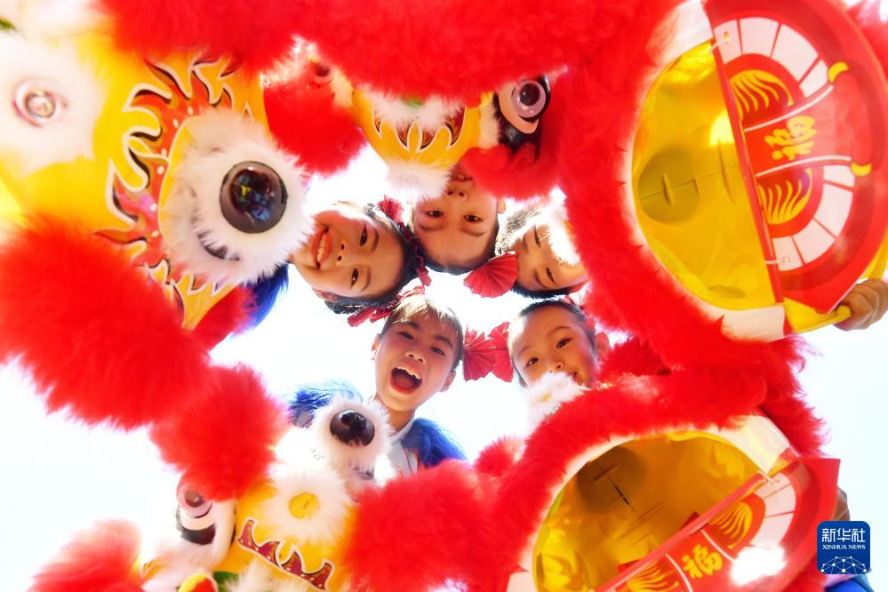9月27日,在山東青島北仲路第一小學(xué)開(kāi)展的國(guó)慶主題系列活動(dòng)上,小學(xué)生在表演獅子舞。