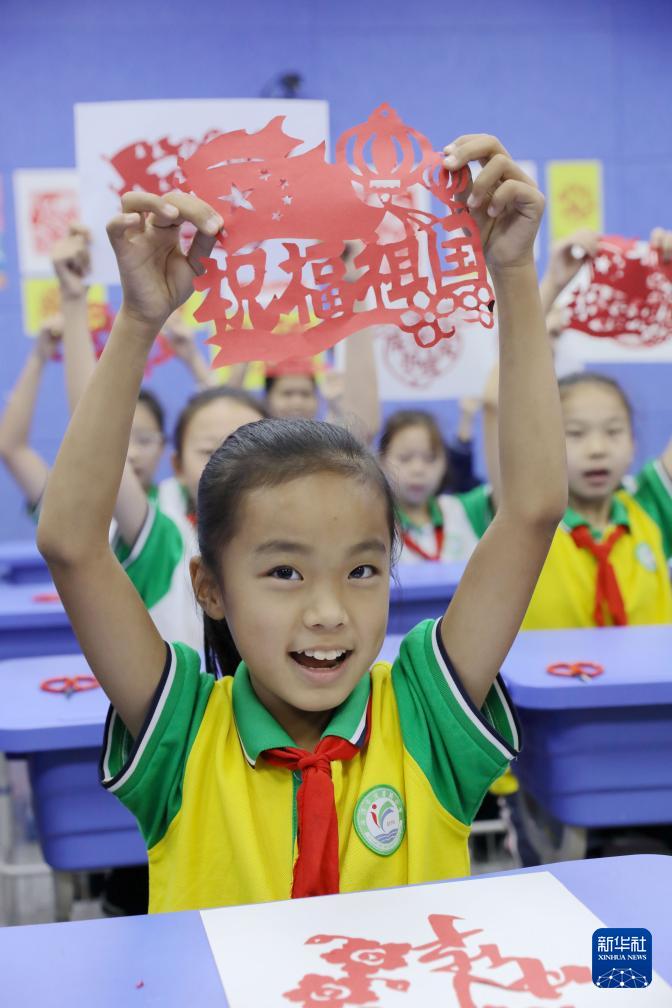 9月27日,在河南省濟(jì)源市健康路小學(xué),孩子們展示“迎國(guó)慶”為主題的剪紙作品。
