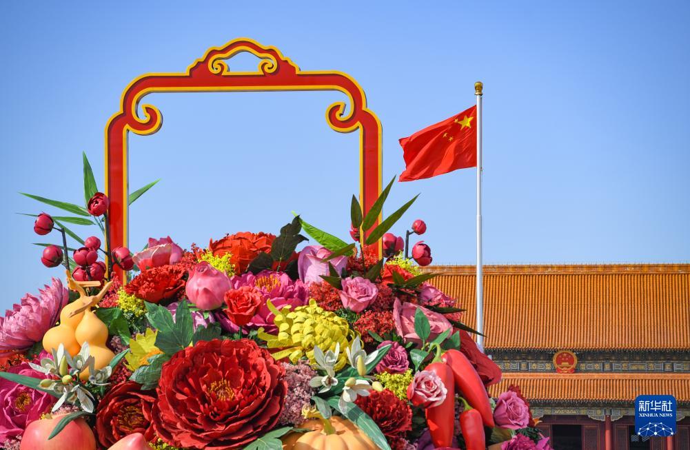 9月25日,五星紅旗在天安門廣場(chǎng)“祝福祖國(guó)”巨型花籃前飄揚(yáng)。