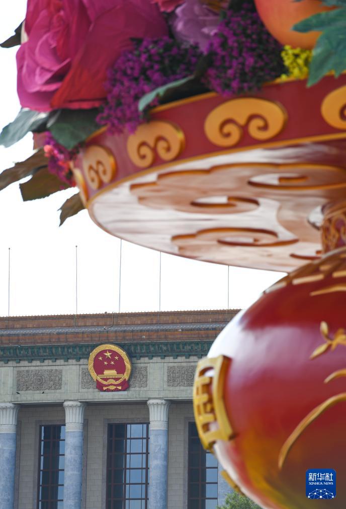 9月25日拍攝的天安門廣場“祝福祖國”巨型花籃與人民大會堂。