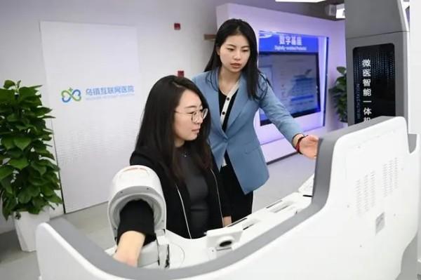 2023年11月,參觀者在烏鎮(zhèn)互聯(lián)網(wǎng)醫(yī)院體驗(yàn)智能一體機(jī)的體檢功能,并與醫(yī)生進(jìn)行視頻連線。