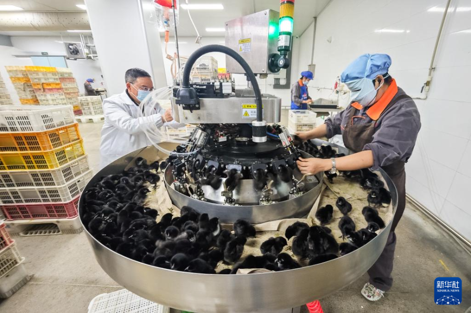 11月29日,在石門縣一家家禽加工企業(yè)雞苗處理車間,工作人員使用自動(dòng)化設(shè)備給雛雞打疫苗。