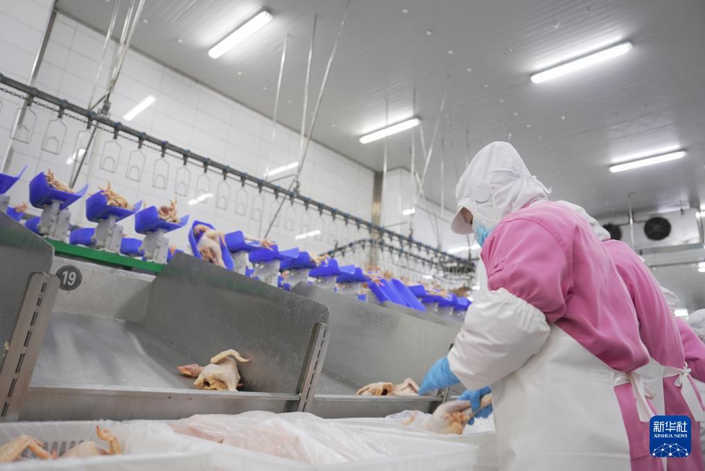 11月29日,在石門縣一家家禽加工企業(yè)冷鏈車間,工人在包裝雞肉。