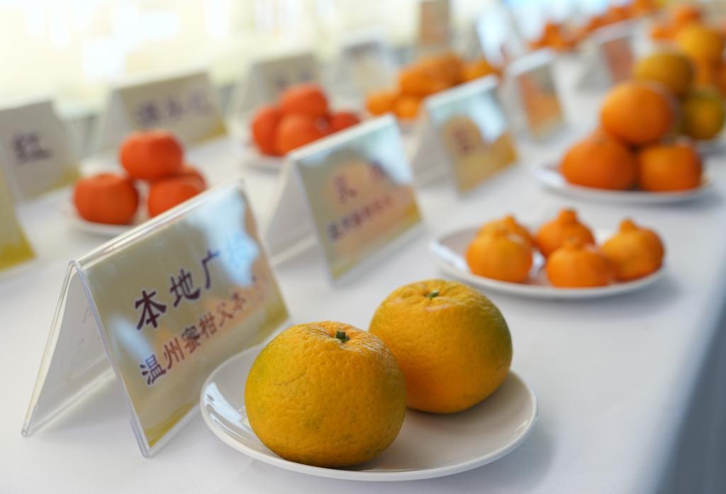 中國黃巖蜜橘種源研究中心內(nèi),各品種柑橘集中展示。新華社記者周佳誼 攝