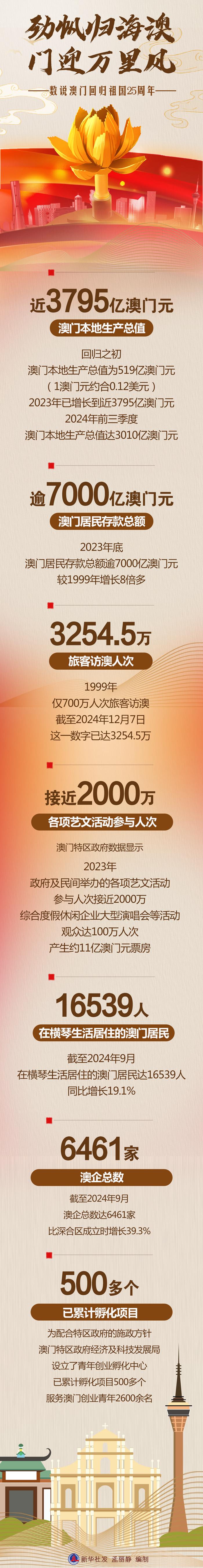 回歸祖國(guó)25年來(lái),在“一國(guó)兩制”方針指引下,在中央政府和祖國(guó)內(nèi)地的大力支持下,澳門(mén)實(shí)現(xiàn)向現(xiàn)代化國(guó)際都市的華麗轉(zhuǎn)身。澳門(mén)特別行政區(qū)政府與社會(huì)各界攜手并進(jìn),積極探索適合自身的發(fā)展路徑,在經(jīng)濟(jì)、民生等領(lǐng)域取得顯著成就。 新華社發(fā) 孟麗靜 編制