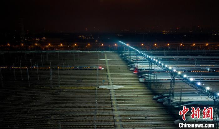 14日凌晨3時(shí),在武漢動(dòng)車段存車線上,百余組動(dòng)車整齊排列,勢(shì)如“陸地航母”,即將啟航迎接回家的人們。(完)