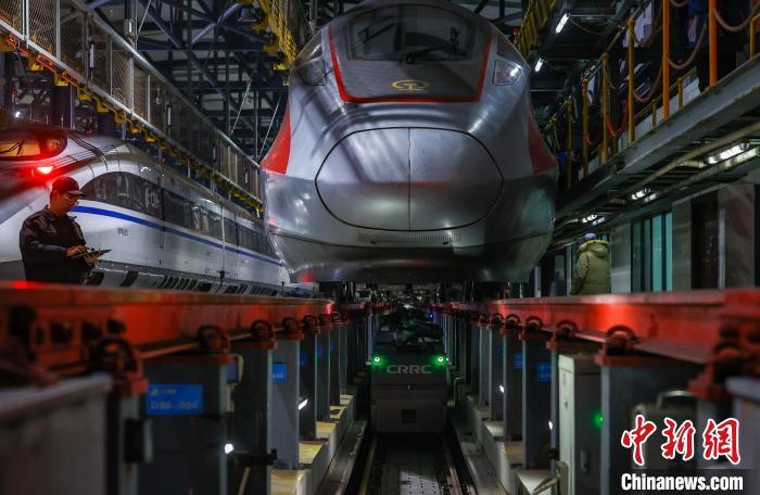 春運(yùn)即將啟幕,1月13日晚11時(shí)許,走進(jìn)華中最大動(dòng)車檢修基地——武漢動(dòng)車段,武漢動(dòng)車運(yùn)用車間里燈火通明,伴隨鳴笛聲和通風(fēng)機(jī)轟隆隆的聲音,一列列動(dòng)車或緩緩駛?cè)霗z修庫(kù),或停留在軌道進(jìn)行檢修。