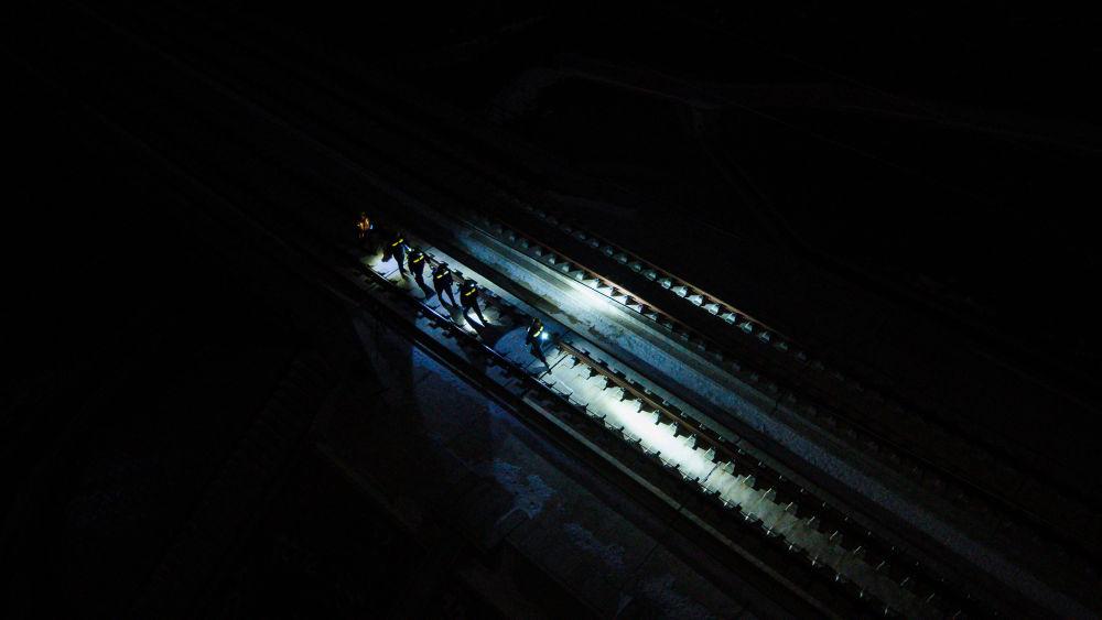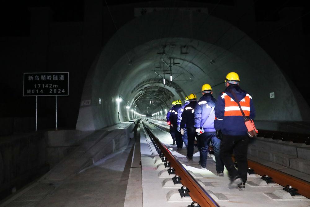 1月14日凌晨,在新烏鞘嶺隧道內(nèi),線路工使用鐵路軌道檢查儀檢查線路幾何尺寸。新華社記者 郎兵兵 攝