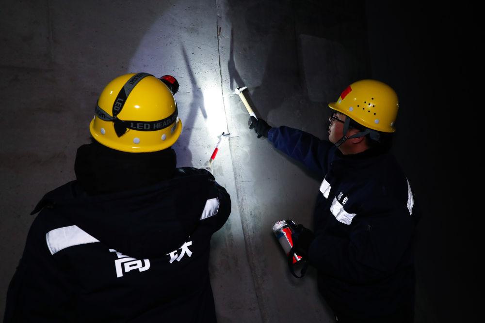 1月14日凌晨,在新烏鞘嶺隧道內(nèi),橋隧工使用小錘檢查邊墻和施工縫。新華社記者 郎兵兵 攝