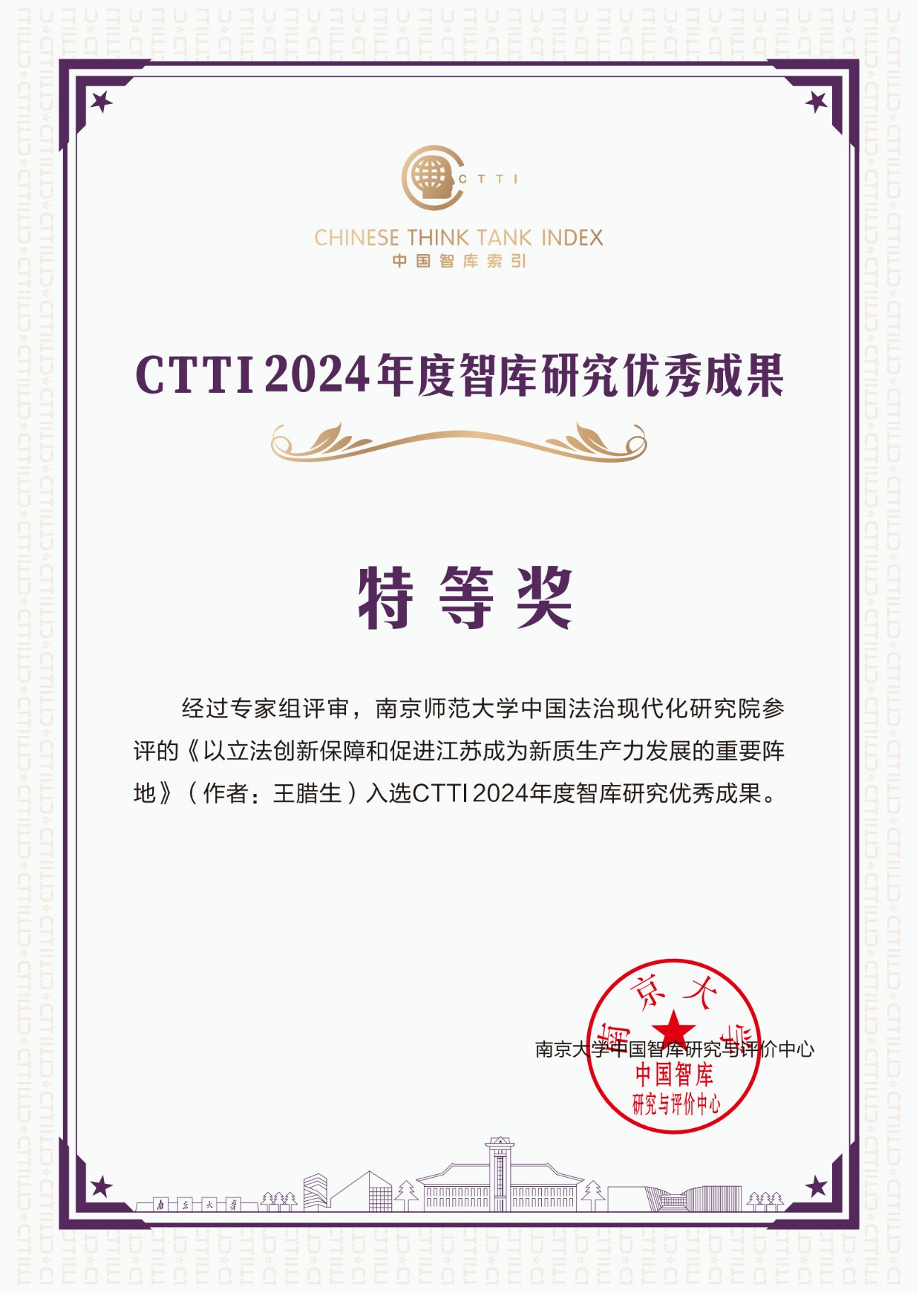 2024年12月7日,南京大學(xué)中國智庫研究與評(píng)價(jià)中心公布,南京師范大學(xué)中國法治現(xiàn)代化研究院的《以立法創(chuàng)新保障和促進(jìn)江蘇成為新質(zhì)生產(chǎn)力發(fā)展的重要陣地》被評(píng)選為CTTI2024年度智庫研究優(yōu)秀成果特等獎(jiǎng)。