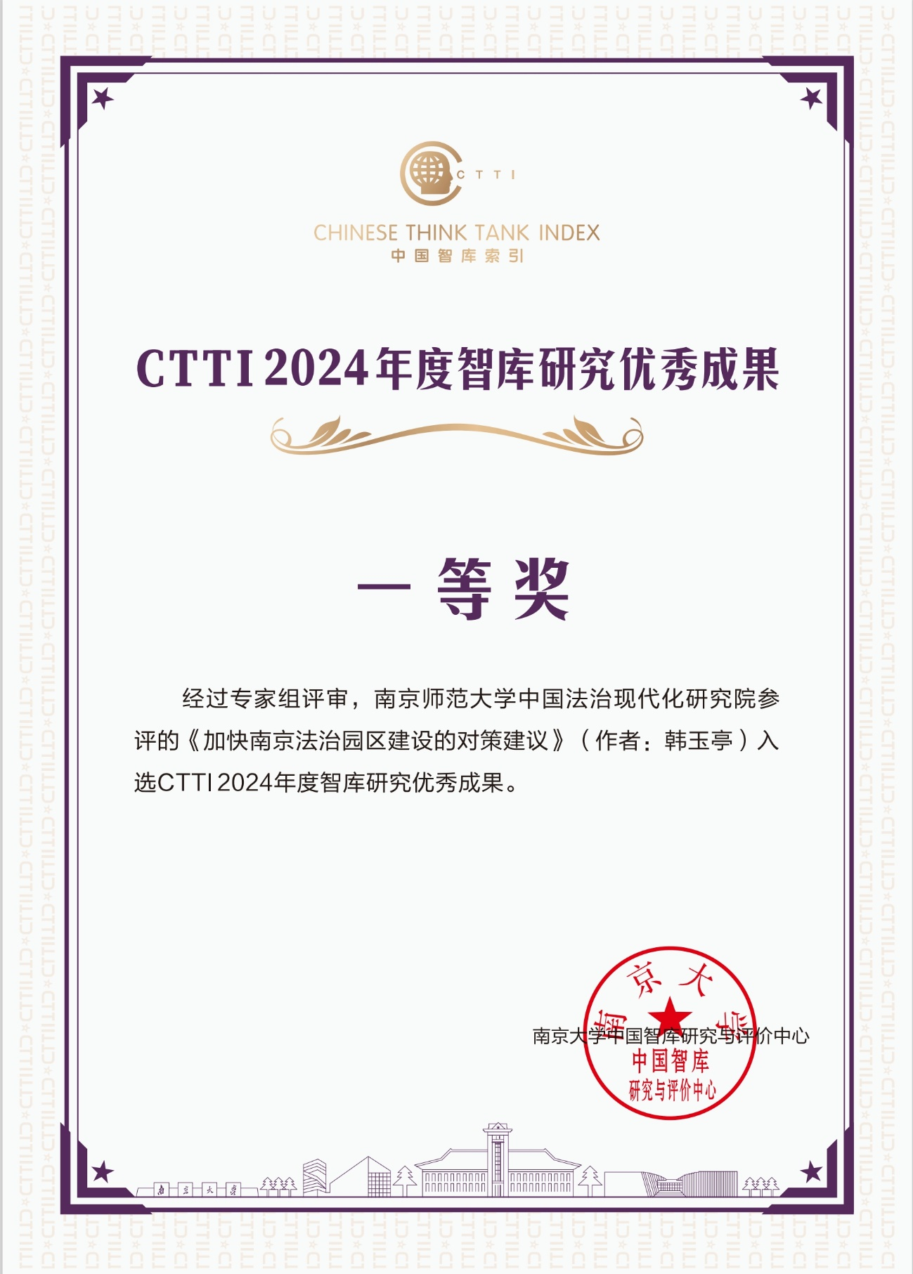 2024年12月7日,南京大學中國智庫研究與評價中心公布,南京師范大學中國法治現(xiàn)代化研究院的《加快南京法治園區(qū)建設(shè)的對策建議》入選CTTI2024年度智庫研究優(yōu)秀成果一等獎。