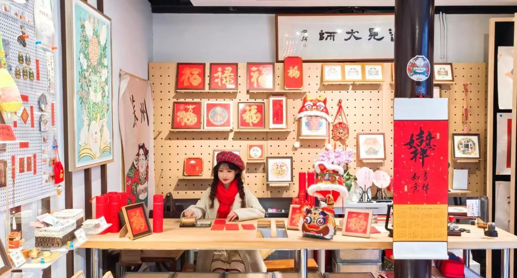 臨近春節(jié),蘇州市姑蘇區(qū)大儒巷38號(hào)的平江文化中心內(nèi)一片熱鬧,不少游客在桃花塢木版年畫展示銷售中心一團(tuán)和氣館中,體驗(yàn)?zāi)戤嬛谱鬟^程,選購(gòu)非遺文創(chuàng)產(chǎn)品,沉浸式感受中華優(yōu)秀傳統(tǒng)文化的獨(dú)特魅力?!吧吣暌獊砹?,我特意來買一些與生肖相關(guān)的年畫和趣味擺件,為家中增添喜慶和福氣?!笔忻穸排空f。