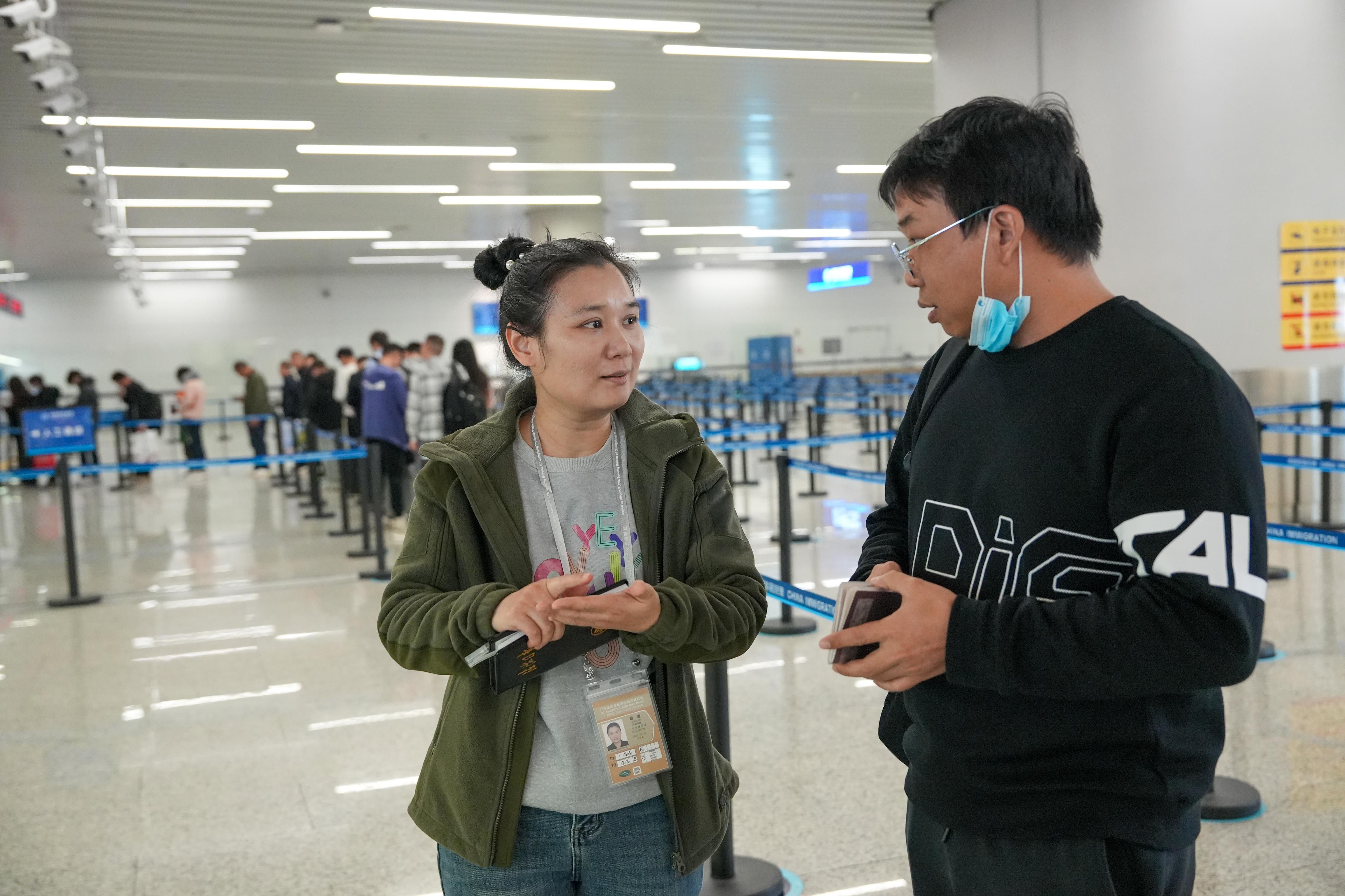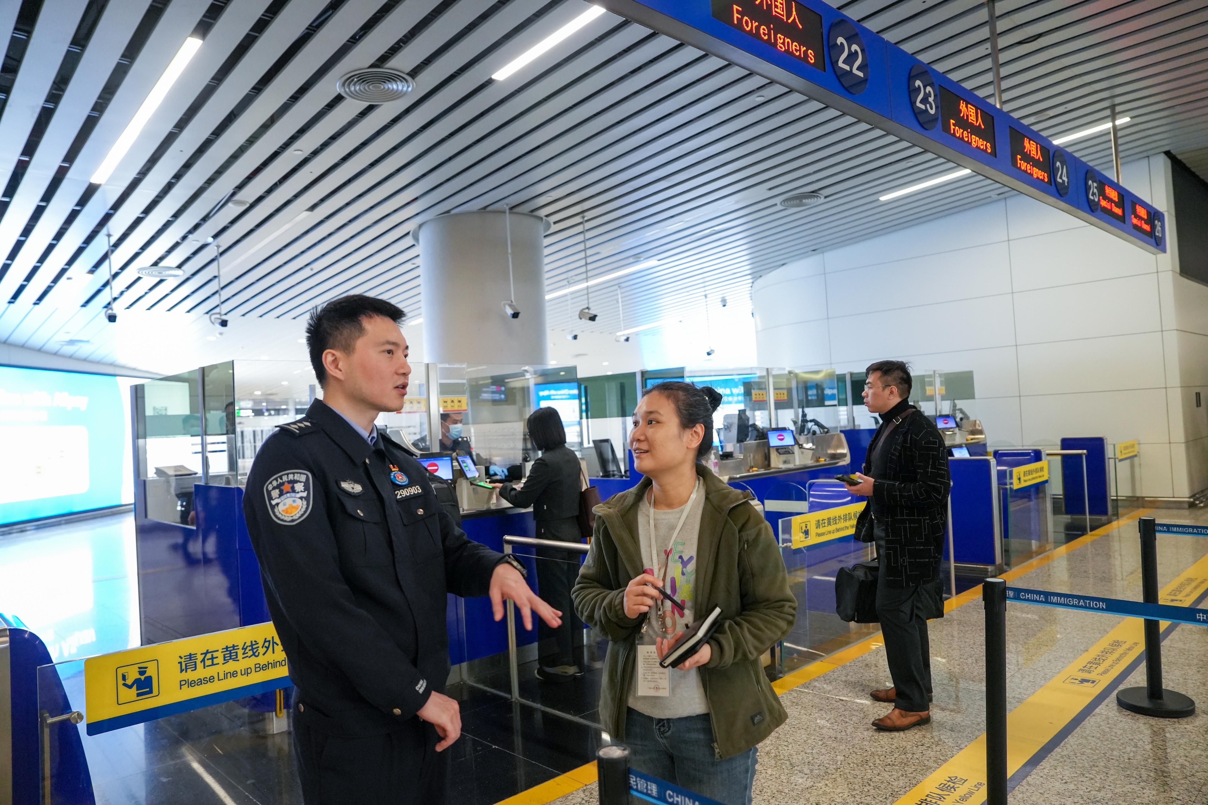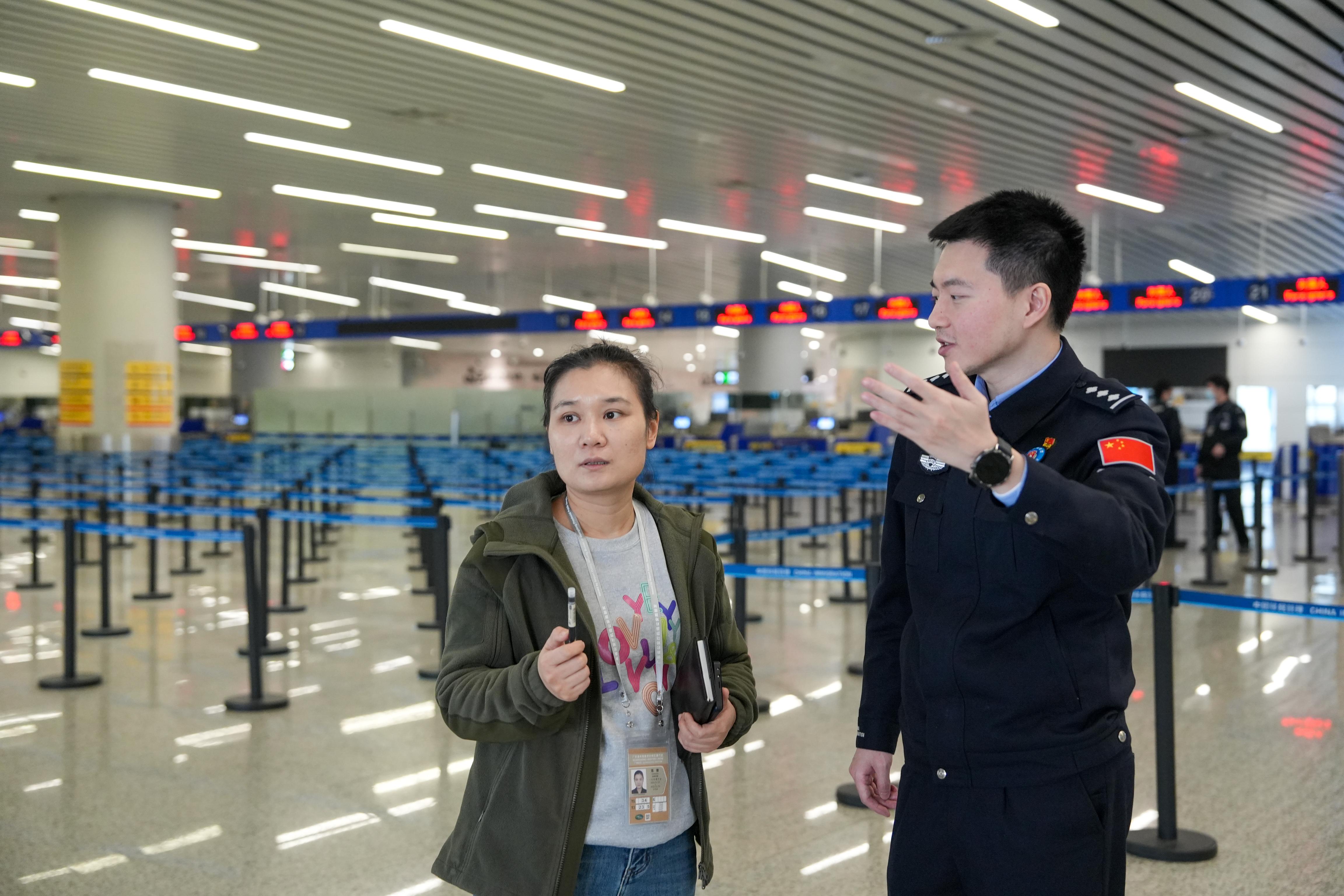 白云邊檢站民警向記者介紹春運(yùn)工作情況。