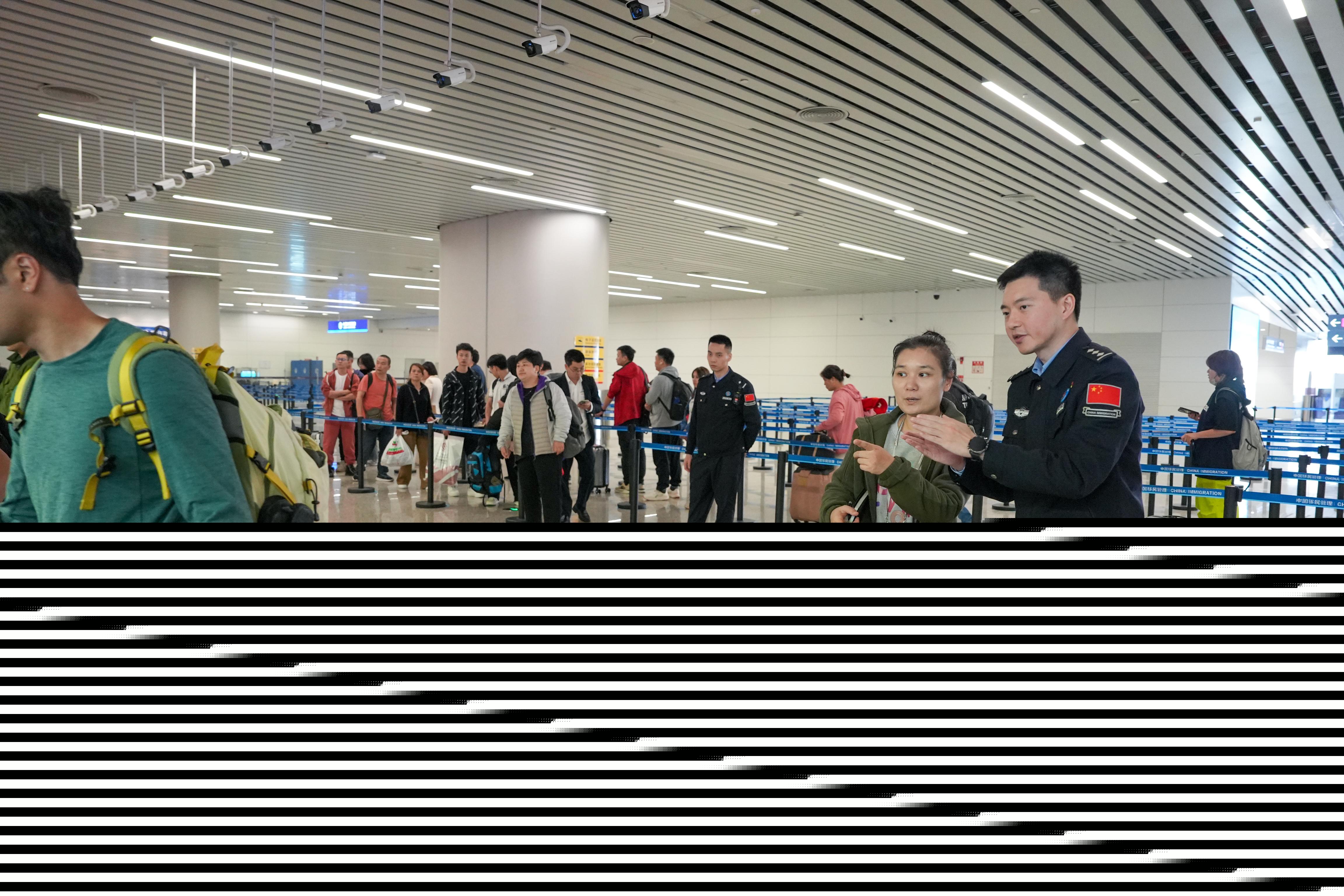 通關(guān)后不久,更多的入境航班抵達(dá)了,口岸大廳立即喧鬧起來(lái)。記者看到,在候檢的隊(duì)伍里,既有歸家的游子,也有被“240小時(shí)過(guò)境免簽政策”所吸引、想來(lái)深度體驗(yàn)“中國(guó)年”的外國(guó)友人。