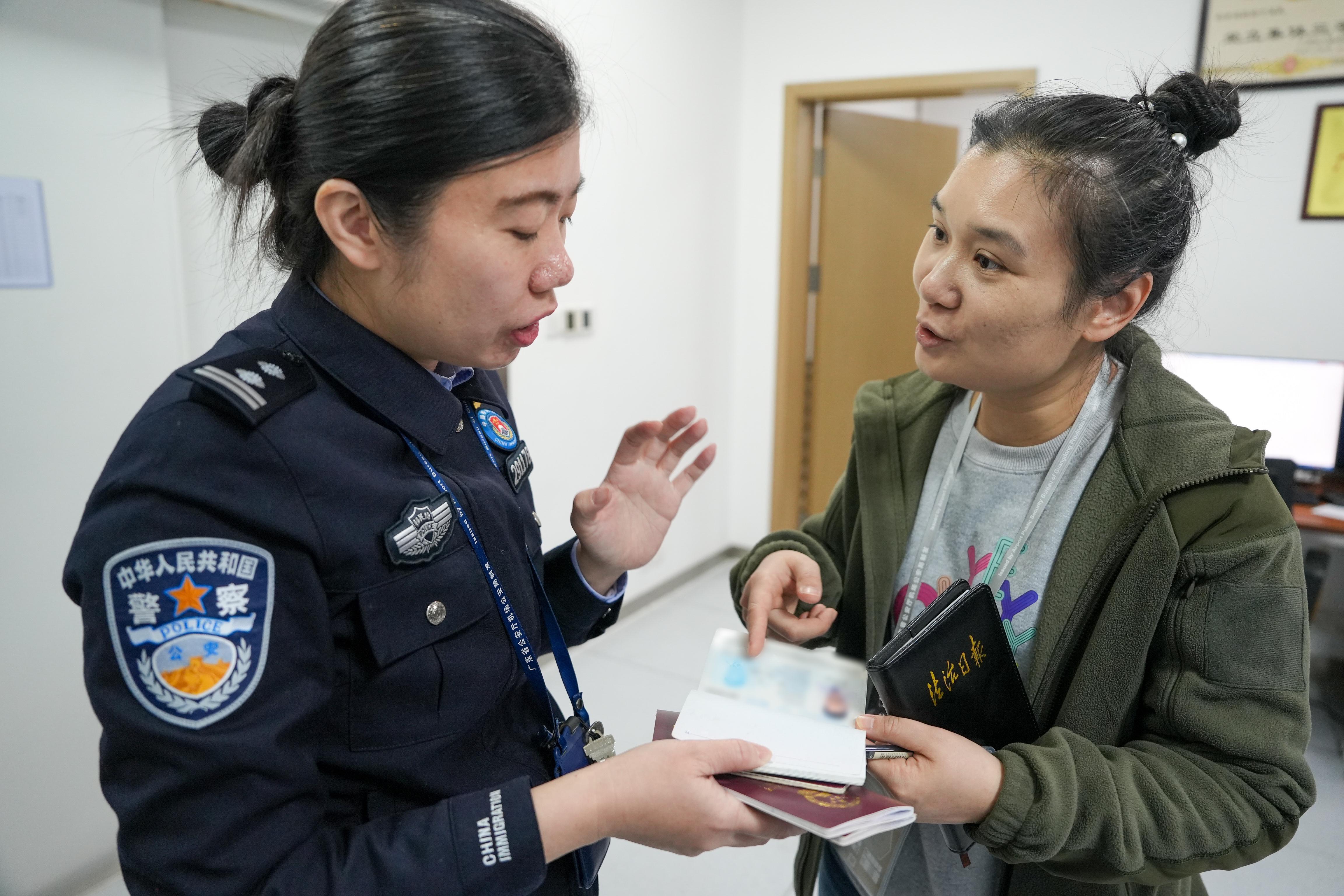 白云邊檢站民警向記者介紹驗(yàn)證工作。