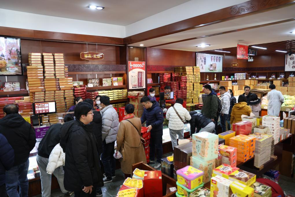 臨近除夕,天津桂發(fā)祥十八街麻花旗艦店內(nèi)人頭攢動(dòng),以麻花為主的年貨商品包裝精美、琳瑯滿目,多個(gè)收銀臺前叫單不斷、排起長隊(duì)。