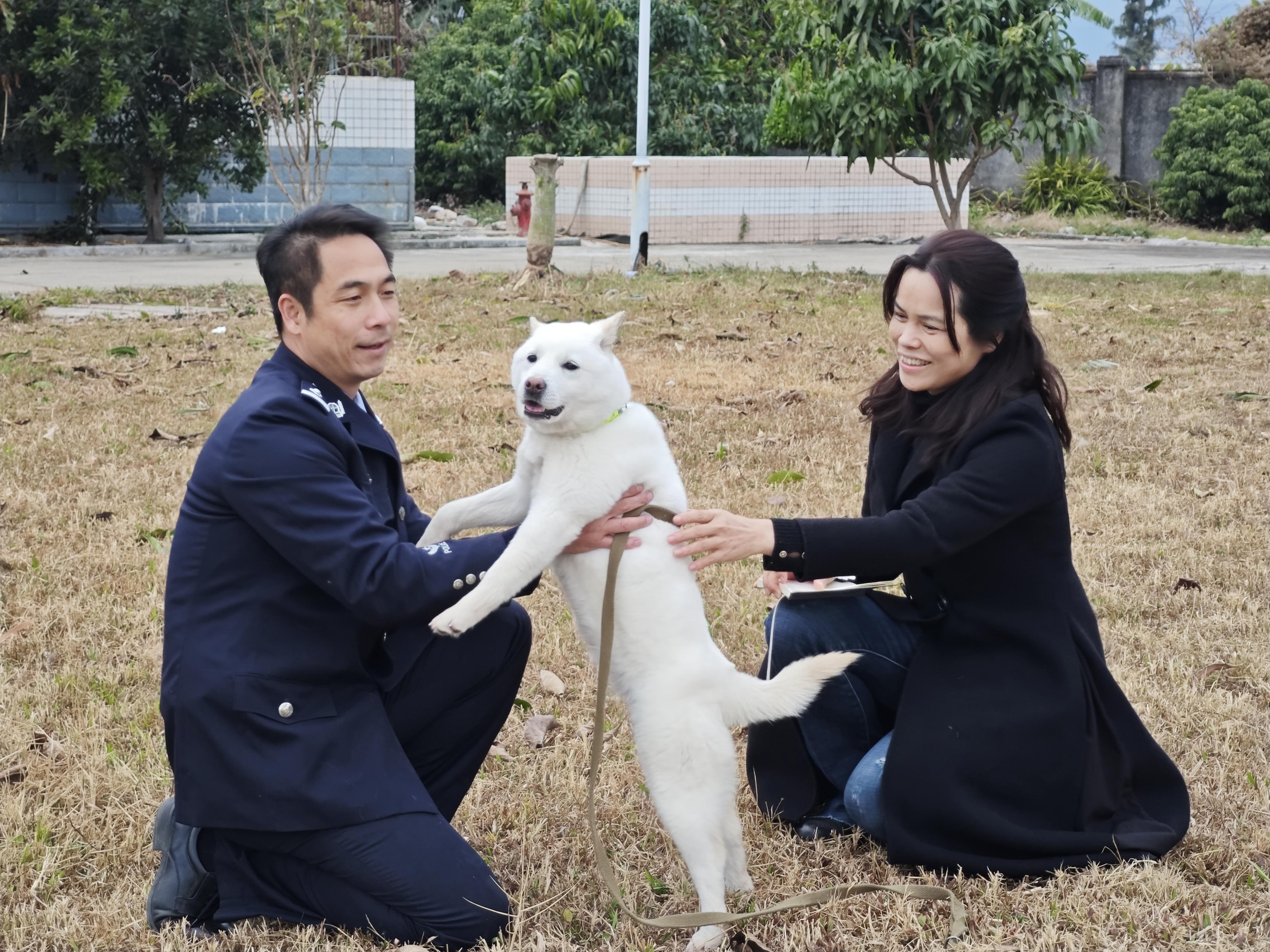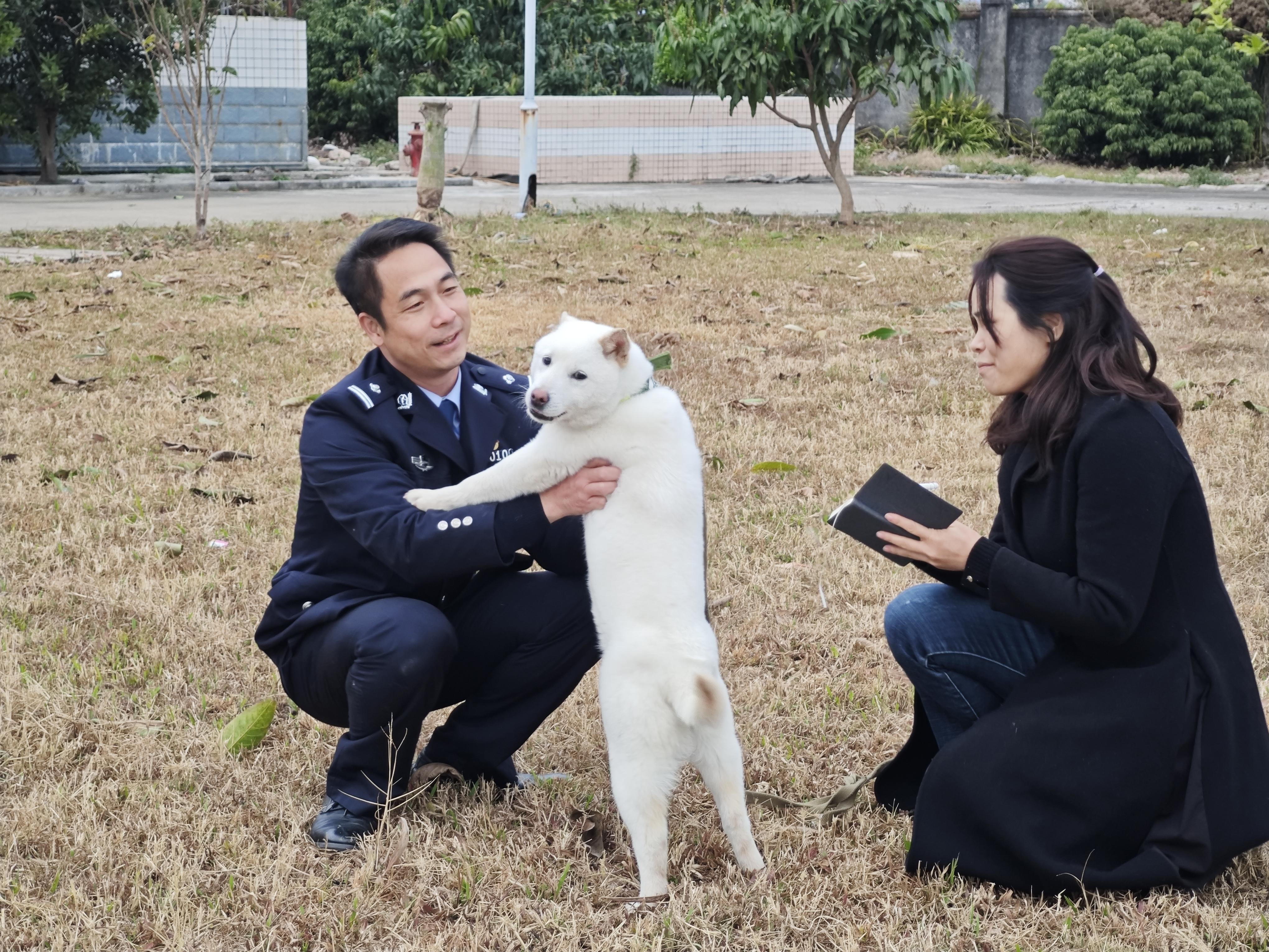 說話間,兩名訓(xùn)導(dǎo)員帶著他們的山地警犬從犬舍中走了出來,其中一身白毛的名叫小龍女,訓(xùn)導(dǎo)員剛一松手,它就直奔記者而來,后腿直立著把兩只前爪搭在記者的左腿上,在眾人的笑聲中,迅即跑開,撲向另一人。和小龍女的活潑不同,另一只小布丁則顯得很文靜,在記者試圖給它拍照時,它迅速躲到了訓(xùn)導(dǎo)員羅飛亮的身后。羅飛亮蹲下身,輕輕地拍它的背,撫摸它的頭,安慰著它。