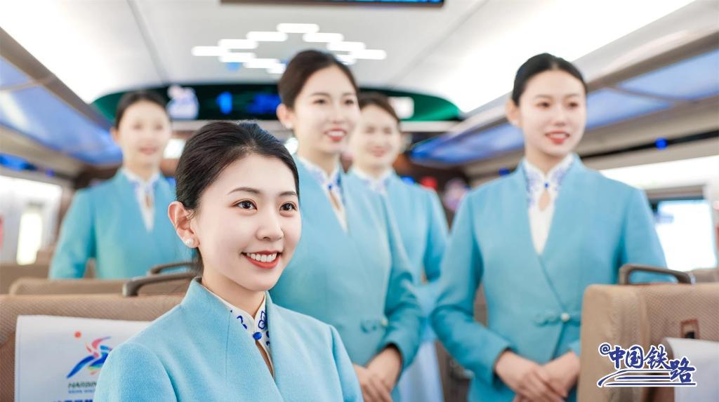 列車上,乘務(wù)員身著帶有雪花刺繡的藍(lán)白衣裙,熱情、得體地與乘客交流。車廂內(nèi)印有亞冬會(huì)元素的時(shí)刻表、貼紙隨處可見(jiàn),營(yíng)造出濃厚的冰雪體育盛會(huì)氛圍。