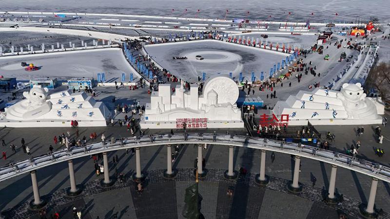 這是1月8日在哈爾濱道里區(qū)的防洪紀(jì)念塔廣場(chǎng)拍攝的亞冬會(huì)吉祥物雪雕“濱濱”和“妮妮”(無人機(jī)照片)。新華社記者 王松 攝