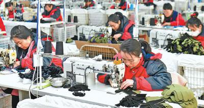 山東嘉祥縣,工作人員在濟(jì)寧全成手套有限公司生產(chǎn)車間縫制滑雪手套。
