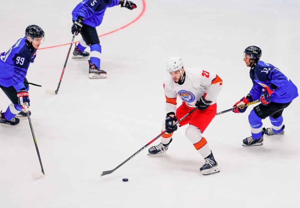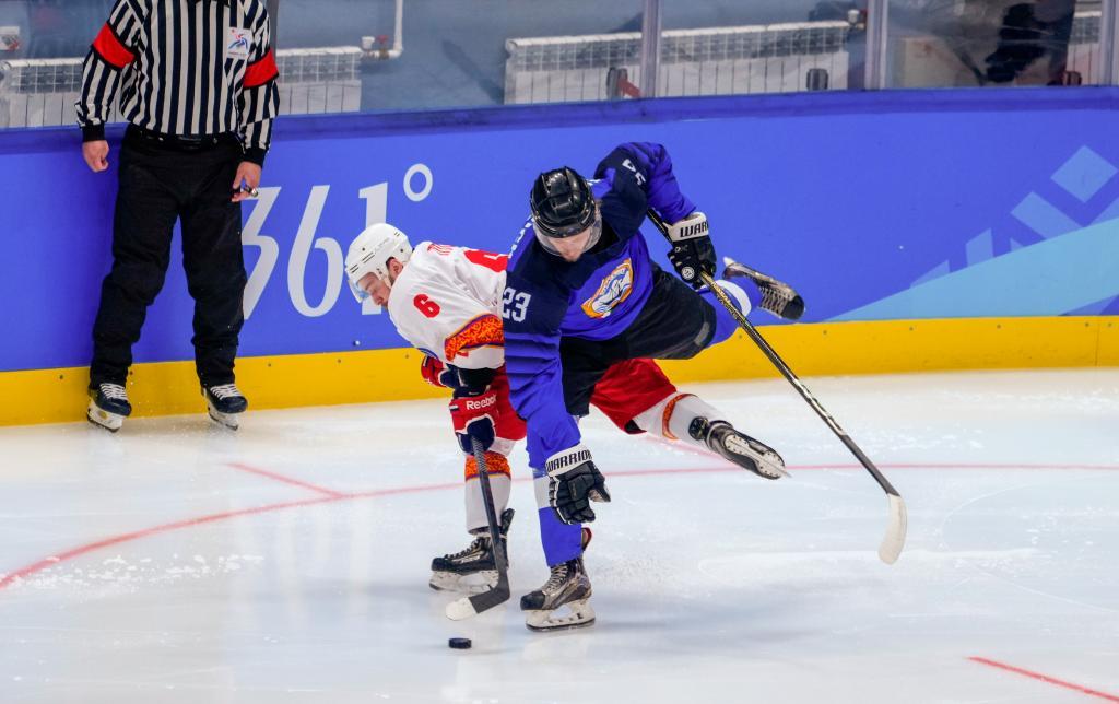 2月3日,吉爾吉斯斯坦冰球隊球員賽福洛夫(右二)在比賽中。新華社記者 王建威 攝