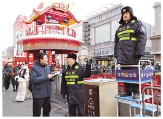 在中街知名的頭條胡同,一組由沈河公安分局統(tǒng)一部署的五里河派出所警力正維持秩序,五光十色的老字號小吃美食牌匾下,游客安全有序地游中街、品美食,映射出沈城平安、和諧、幸福的歡度佳節(jié)景象。